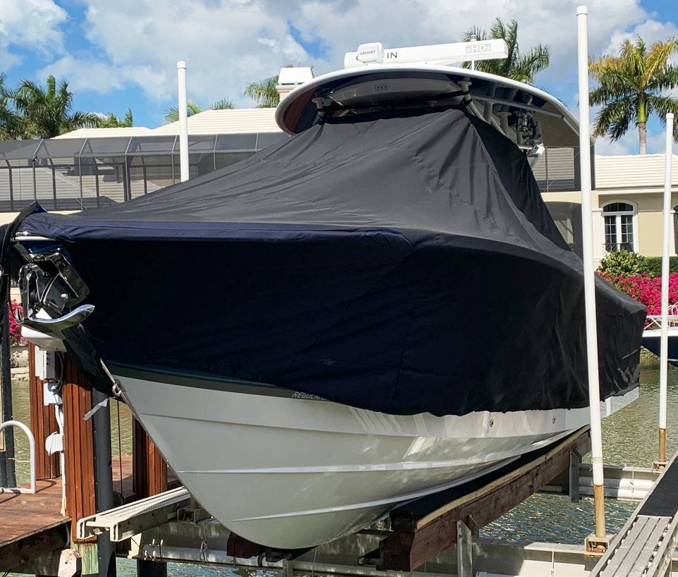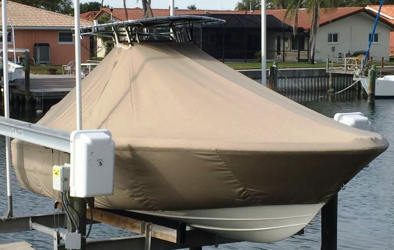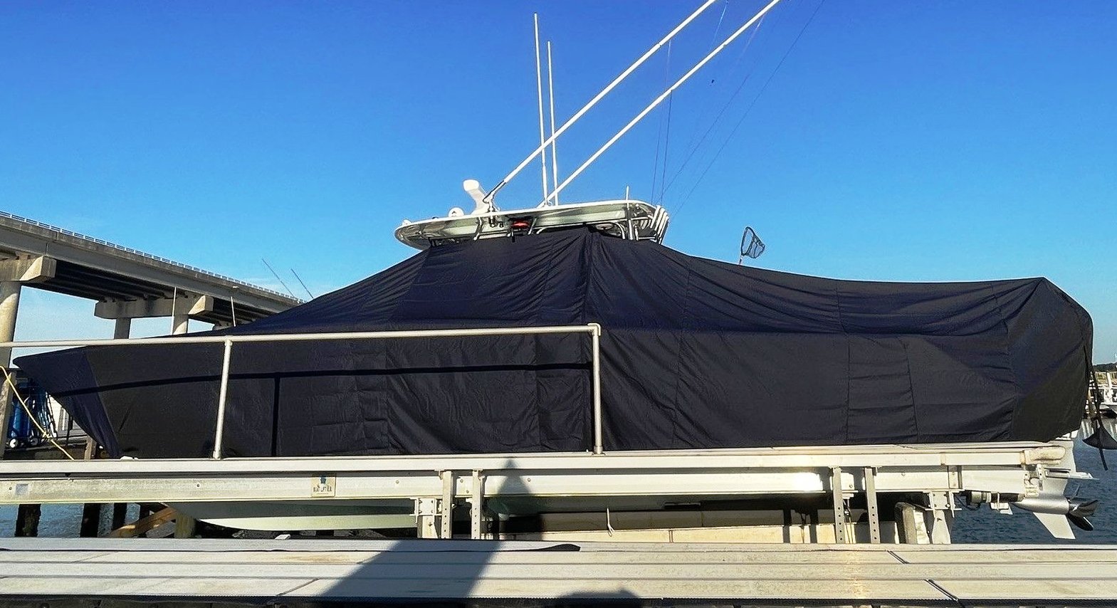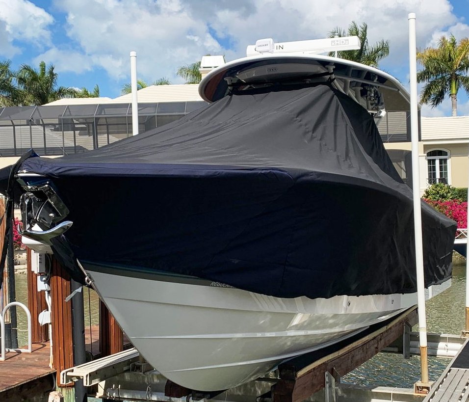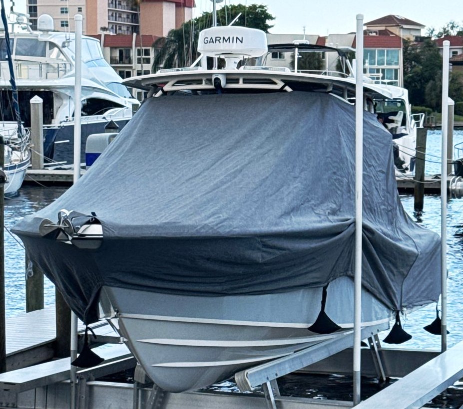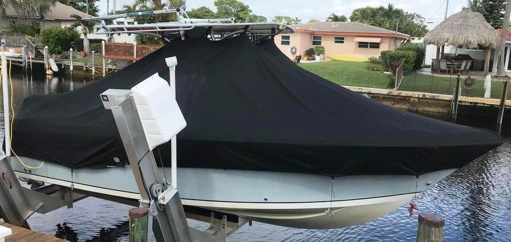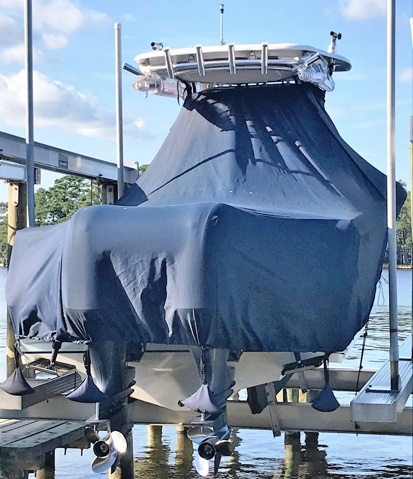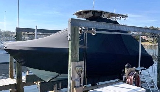 Yellowfin 42CC, 20XX LaPorte TTopCover, TTopCovers™ T-Top boat cover on lift, starboard side from RnR Marine