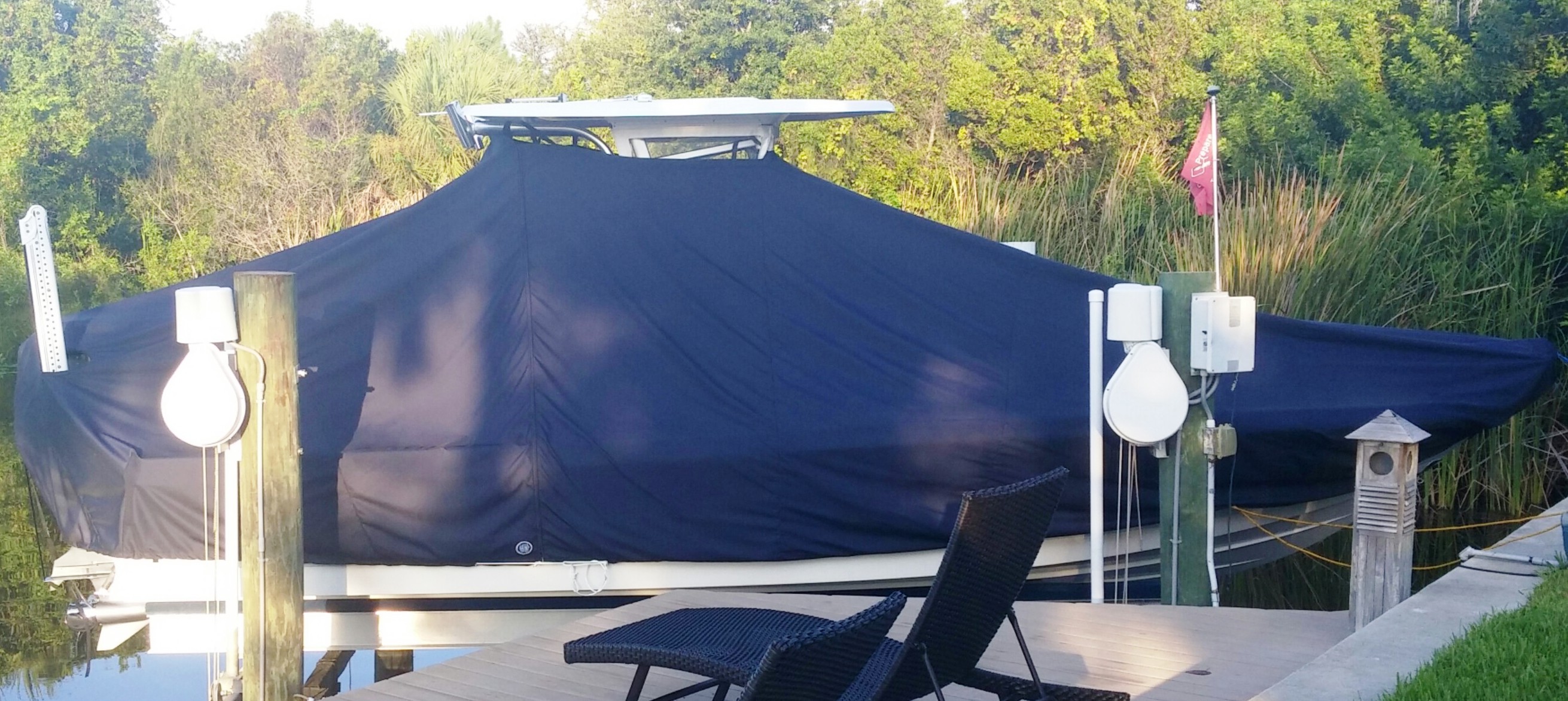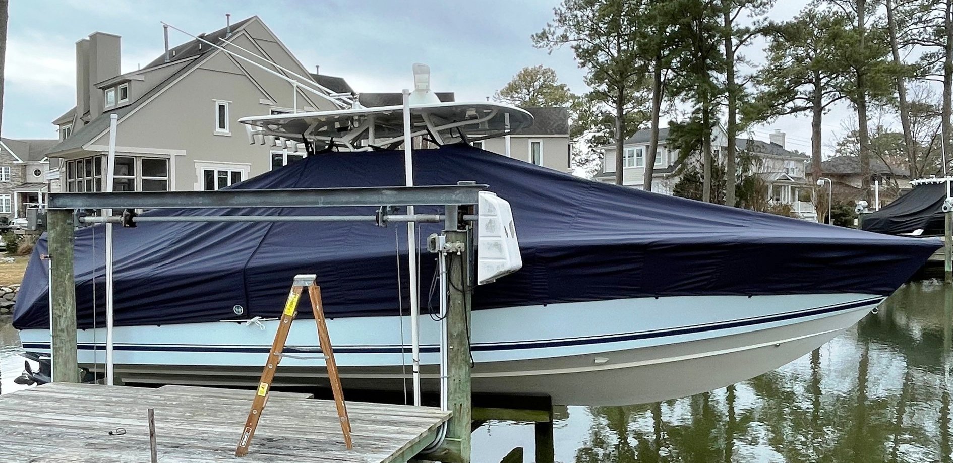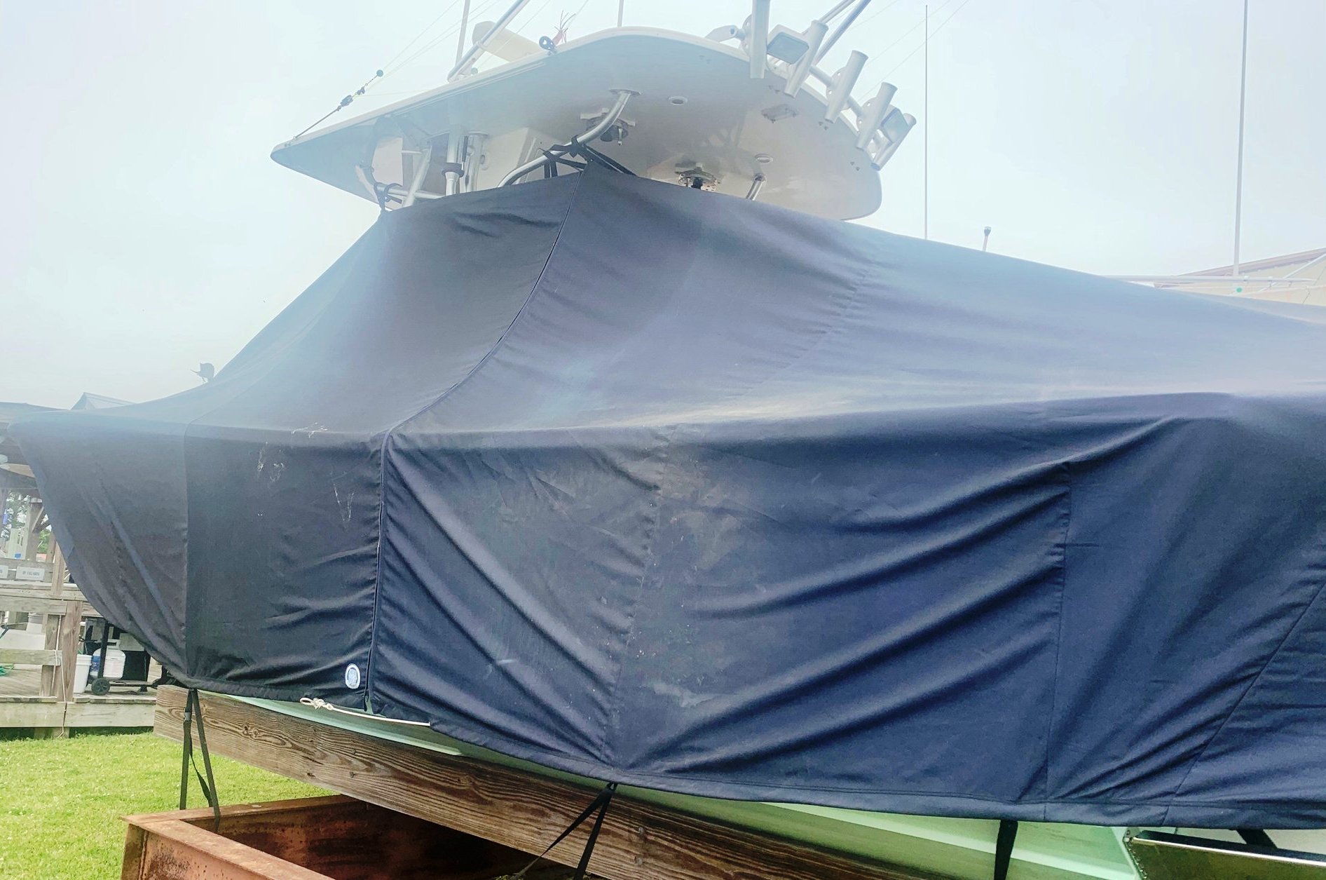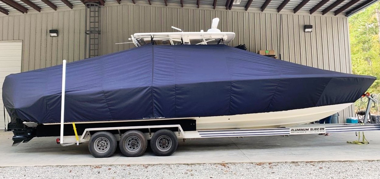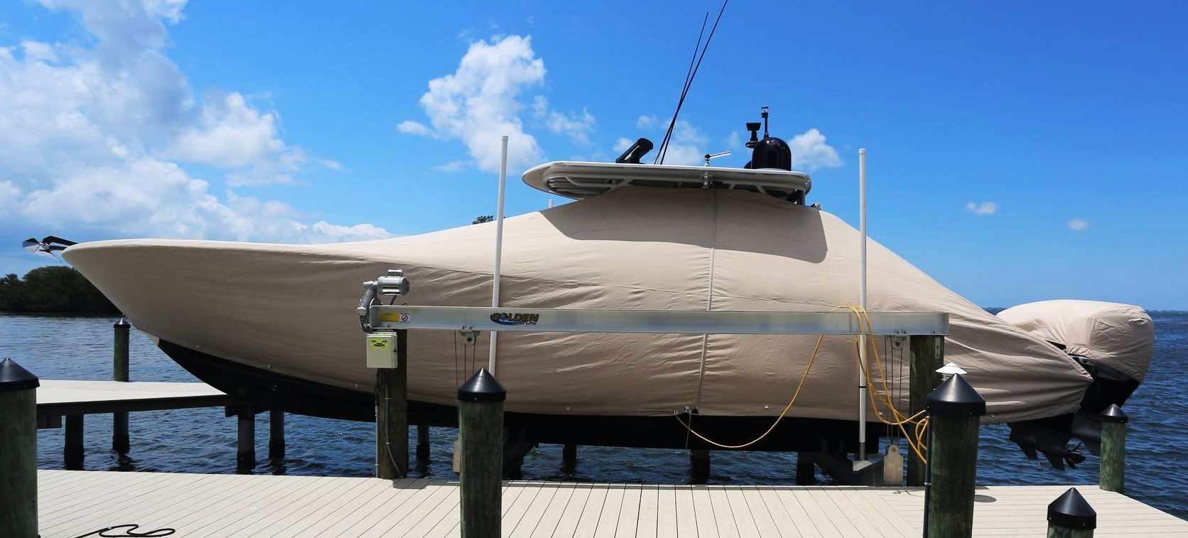 Yellowfin 42CC, 20XX LaPorte TTopCover, TTopCovers™ T-Top boat cover on lift, starboard side from RnR Marine